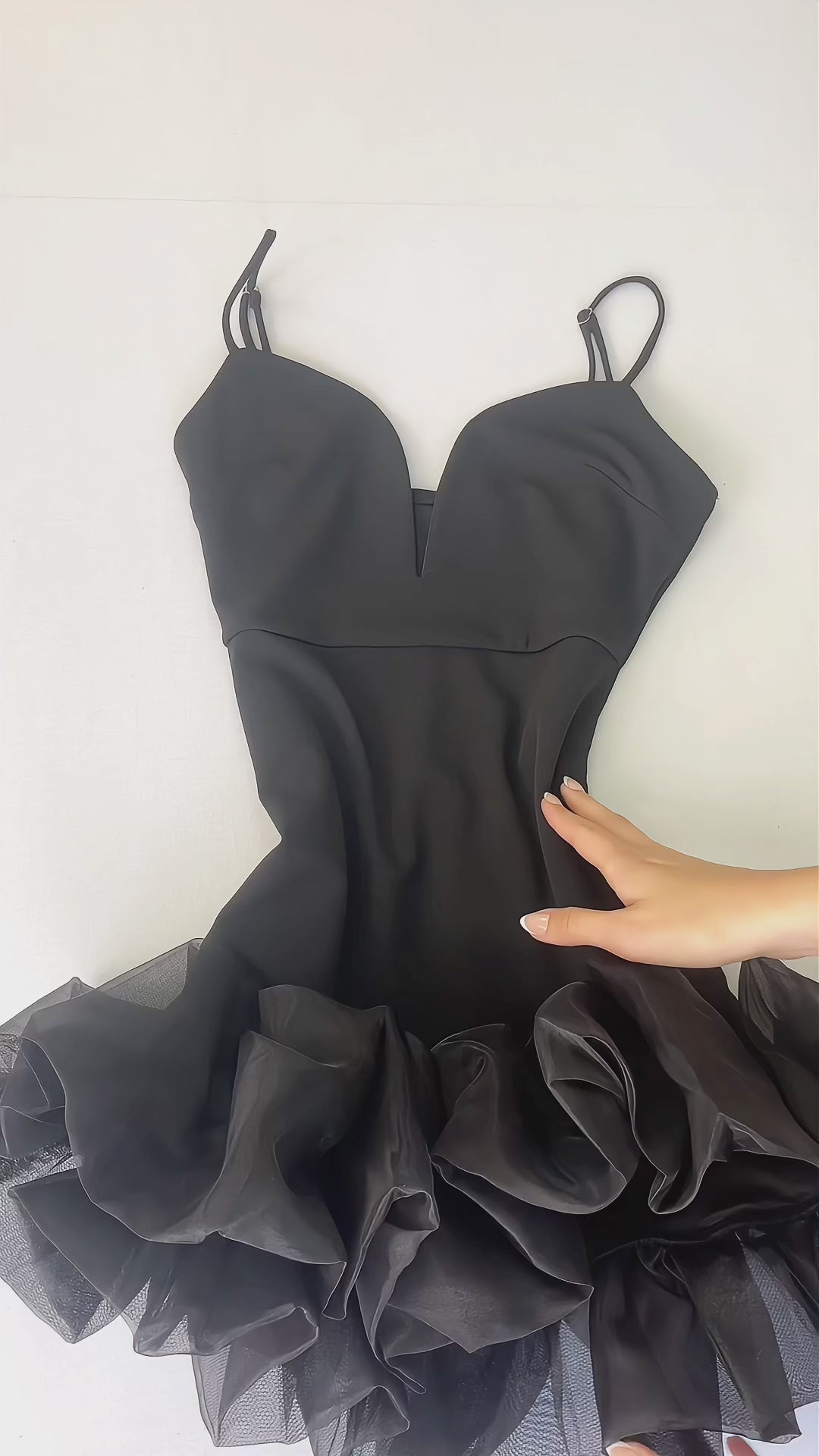 This sleeveless bodycon mini dress combines luxurious techn crepe with a sweetheart neckline and ruffled organza hem, creating an exquisite silhouette. With a perfect blend of elegance and sophistication, it's ideal for making a statement at upscale events and soirées.