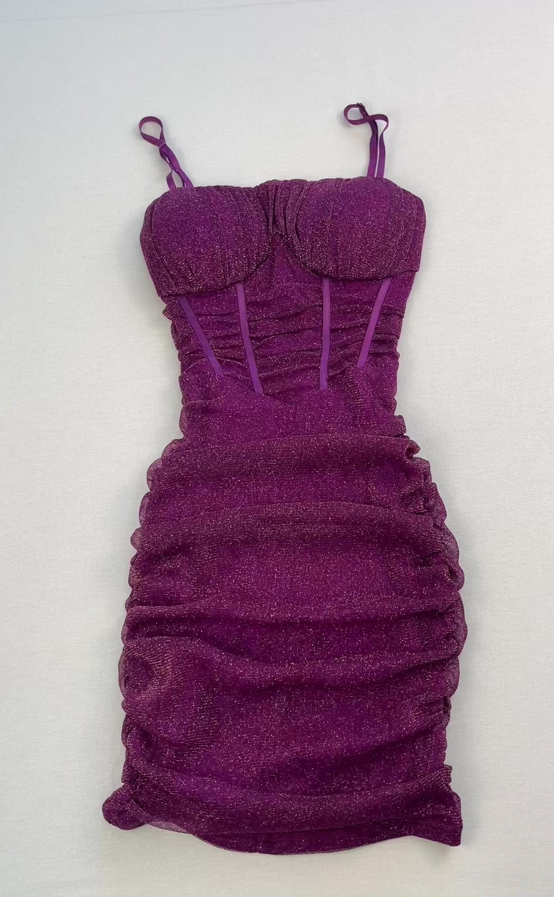 This women's mini dress features ruched detailing in metallic mesh fabric, offering a glamorous and eye-catching look. Perfect for parties or special occasions, it combines texture and shine for a chic and stylish ensemble.