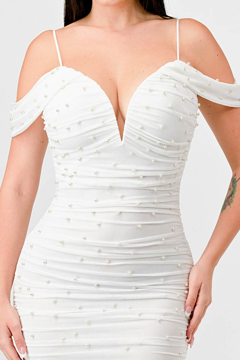 An opulent midi dress adorned with luxe pearl mesh embellishments, featuring cold shoulder details and a sweetheart neckline. Ruched accents and slitted design add allure and sophistication. This dress epitomizes elegance, perfect for making a glamorous statement at any special occasion.