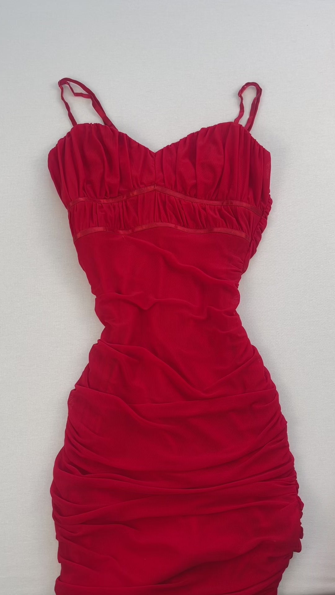 This luxurious midi dress combines sophistication with allure. Crafted from stretch fabric, it hugs the curves elegantly. Mesh contrast detailing and spaghetti straps add a touch of intrigue, while a slit enhances movement, making it perfect for glamorous evenings.