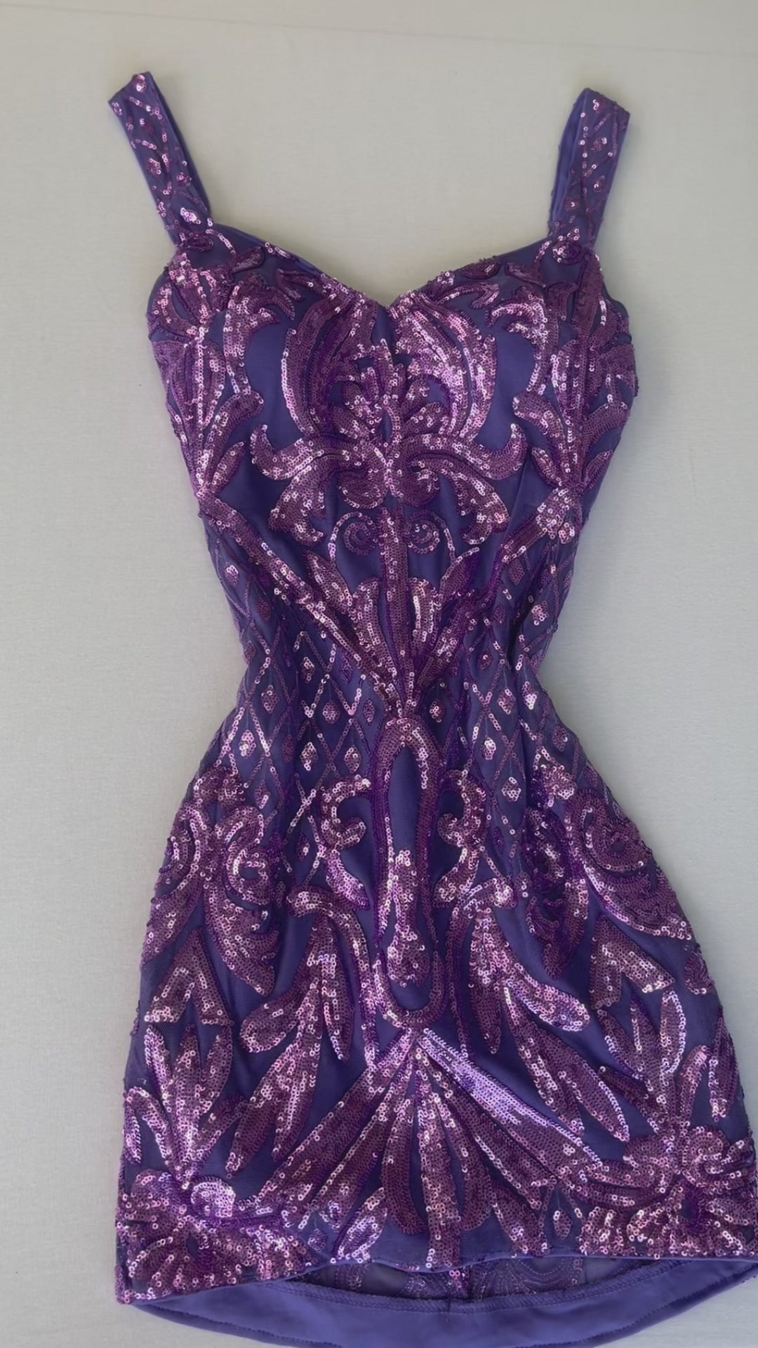 A glamorous statement piece, this body-hugging mini dress dazzles with intricate sequin patterns, exuding opulence and sophistication. Its luxurious embellishments and figure-flattering silhouette make it perfect for nights out and special occasions.