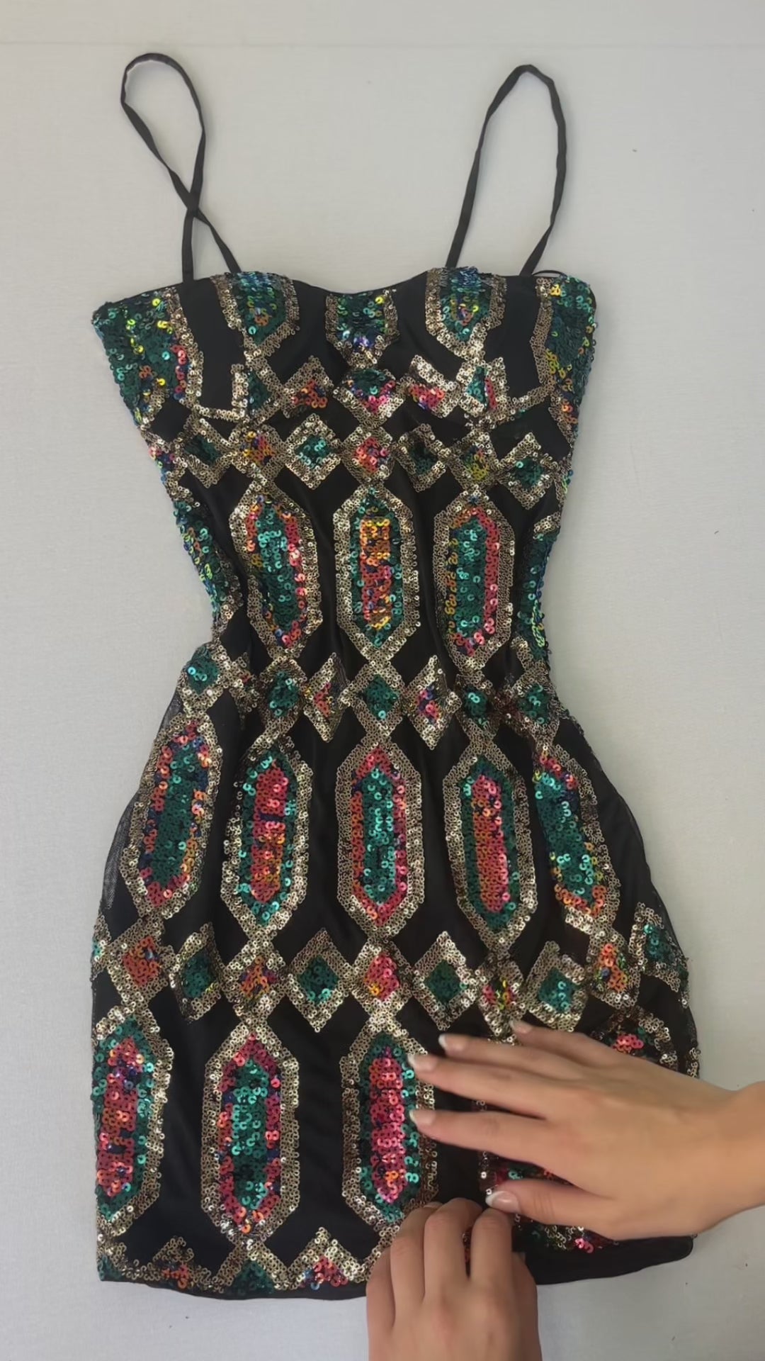 This luxurious mini dress captivates with its intricate details. Adorned with shimmering sequins in an elegant pattern, it exudes opulence. The drawstring lace-up back adds a touch of allure to the sleeveless bodycon silhouette, perfect for unforgettable evenings filled with sophistication.